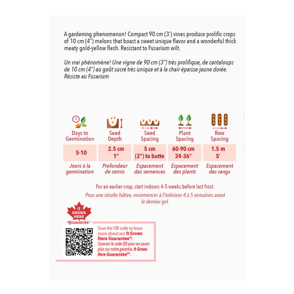 Un vrai phénomène! Une vigne de 90 cm (3′) très prolifique, de cantaloups de 10 cm (4″) au goût sucré très unique et à la chair épaisse et jaune dorée. Résiste au Fusarium
