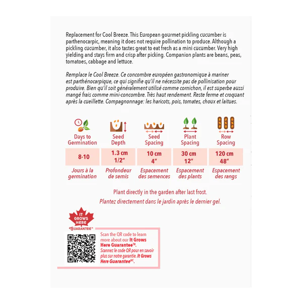Remplace le cool breeze. Ce concombre européen gastronomique à mariner est parthénocarpique, ce qui signifie qu’il ne nécessite pas de pollinisation pour produire. Bien qu’il soit généralement utilisé comme cornichon, il est superbe aussi mangé frais comme mini-concombre. Très haut rendement. Reste ferme et croquant après la cueillette. Compagnonnage: les haricots, pois, tomates, choux et laitues.