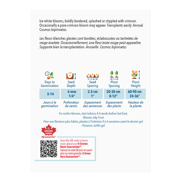 Les fleurs blanches glacées sont bordées, éclaboussées ou tachetées de rouge écarlate. Occasionnellement, une fleur toute rouge peut apparaître. Supporte bien la transplantation. Annuelle. Cosmos Bipinnatus