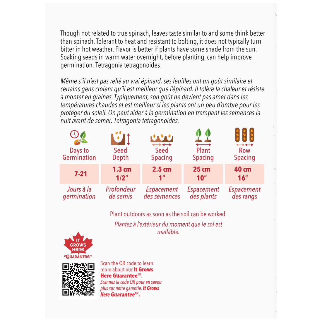 Même s’il n’est pas relié au vrai épinard, ses feuilles ont un goût similaire et certains gens croient qu’il est meilleur que l’épinard. Il tolère la chaleur et résiste à monter en graines. Typiquement, son goût ne devient pas amer dans les températures chaudes et est meilleur si les plants ont un peu d’ombre pour les protéger du soleil. On peut aider à la germination en trempant les semences la nuit avant de semer. Tetragonia Tetragonoides
