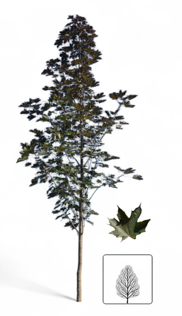 Arbre au feuillage pourpre foncé intense, ‘Crimson Sunset’ se distingue par sa meilleure vigueur et sa résistance accrue aux conditions difficiles comparativement aux autres érables pourpres. Il forme une couronne large et dense, idéal pour créer un impact visuel fort en milieu urbain ou dans les grands aménagements.