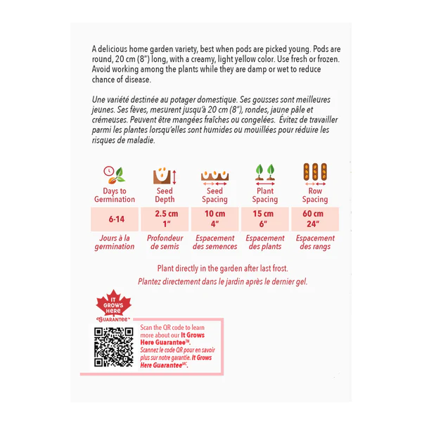 Une variété destinée au potager domestique. Ses gousses sont meilleures jeunes. Ses fèves, mesurent jusqu’à 20 cm (8″), rondes, jaune pâle et crémeuses. Peuvent être mangées fraîches ou congelées. Évitez de travailler parmi les plantes lorsqu’elles sont humides ou mouillées pour réduire les risques de maladies.