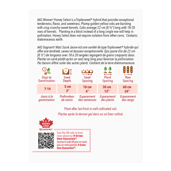 AAS Gagnant! Maïs Sucré Jaune est une variété de type Triplesweet hybride qui offre une tendreté, saveur et douceur exceptionnelle. Épis jaune d’or de 22 cm (8 1/2″) de longueur avec 18 à 20 rangées regorgent de grains croquants doux. Plantez en carré plutôt qu’en un seul rang pour favoriser la pollinisation. Pas besoin d’être isoler des autres plants. Contient de la terre diatmomaceuse.