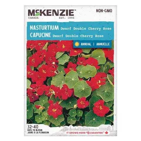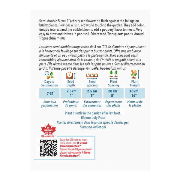 Les fleurs semi-doubles rouge cerise de 5 cm (2″) de diamètre s’épanouissent à la hauteur du feuillage sur des plants buissonnants. Offre une ambiance luxuriante et un peu « vieux-pays » à la plate-bande. Mais elles sont aussi comestibles, ajoutant ainsi de la couleur, de l’intérêt et un goût poivré aux plats. Elle réussit même dans les sols les plus pauvres. Semer directement au jardin. Il n’aime pas être dérangé. Annuelle. Tropaeolum Minus