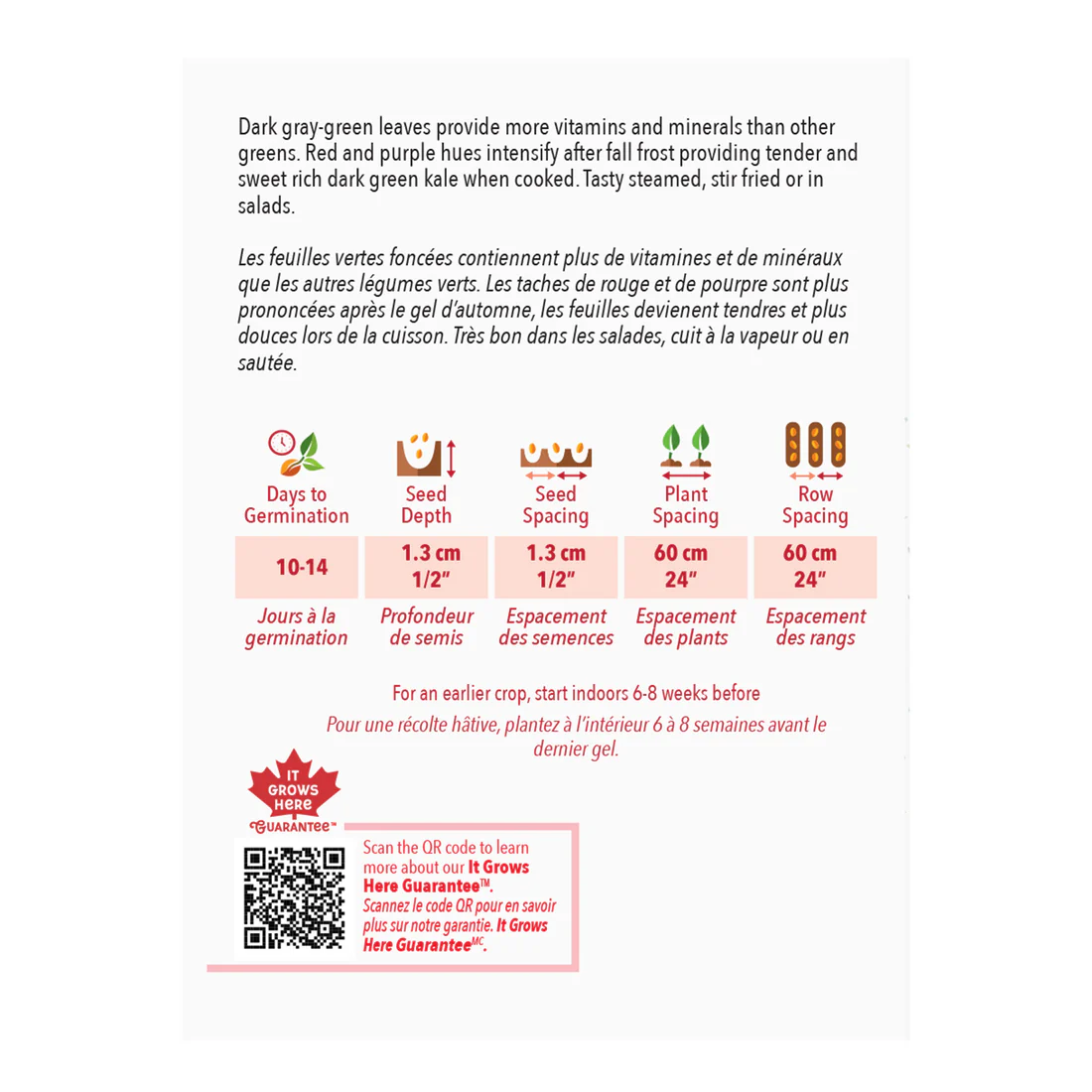 Les feuilles vertes foncées contiennent plus de vitamines et de minéraux que les autres légumes verts. Les taches de rouge et de pourpre sont plus prononcées après le gel d’auntomne, les feuilles deviennent tendres et plus douces lors de la cuisson. Très bon dans les salades, cuit à la vapeur ou en sautée.