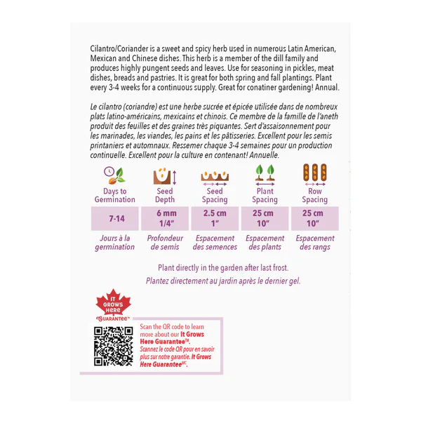 Le cilantro (coriandre) est une herbe sucrée et épicée utilisée dans de nombreux plats latino-américains, mexicains et chinois. Ce membre de la famille de l’aneth produit des feuilles et des graines très piquantes. Sert d’assaisonnement pour les marinades, les viandes, les pains et les pâtisseries. Excellent pour les semis printaniers et automnaux. Ressemer chaque 3-4 semaines pour une production continuelle. Excellent pour la culture en contenant! Hauteur de la plante: 60 cm (24″). Annuelle.