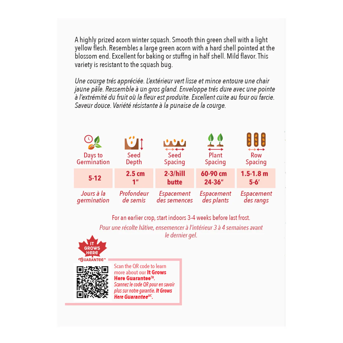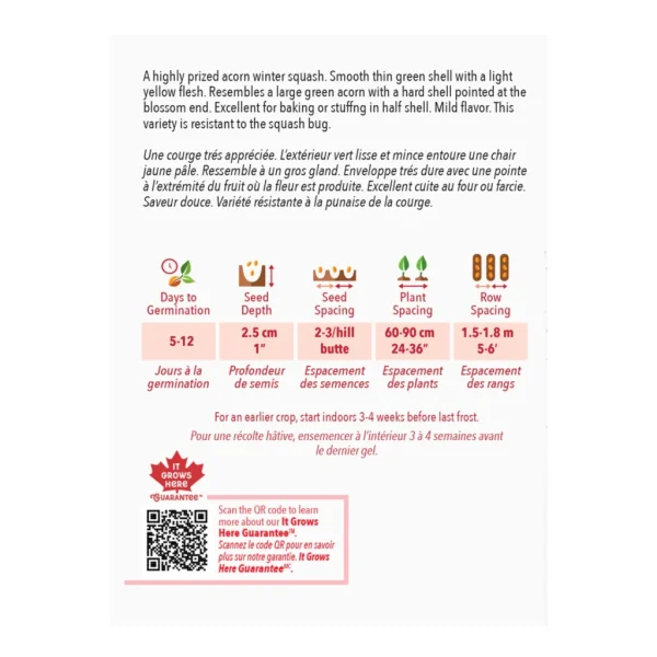 Une courge très appréciée. L’extérieur vert lisse et mince entoure une chair jaune pâle. Ressemble à un gros gland. Enveloppe très dure avec une pointe à l’extrémité du fruit où la fleur est produite. Excellent cuite au four ou farcie. Saveur douce. Variété résistante à la punaise de la courge.