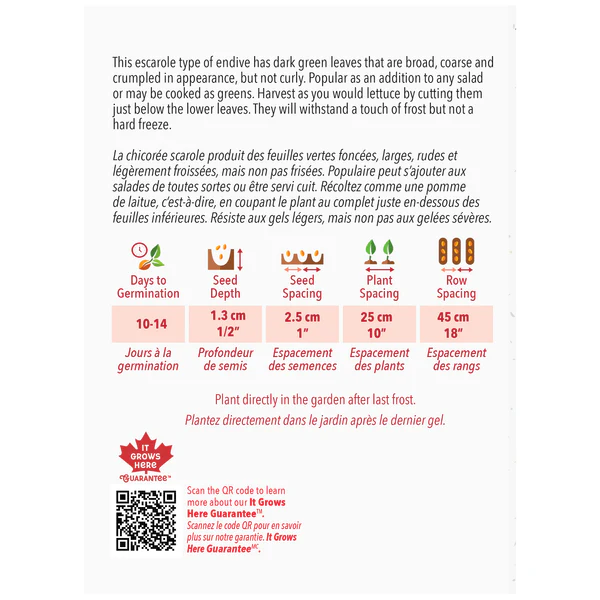 La chicorée scarole produit des feuilles vertes foncées, larges, rudes et légèrement froissées, mais non pas frisées. Populaire peut s’ajouter aux salades de toutes sortes ou être servi cuit. Récoltez comme une pomme de laitue, c’est-à-dire, en coupant le plant au complet juste en dessous des feuilles inférieures. Résiste aux gels légers, mais non pas aux gelées sévères.