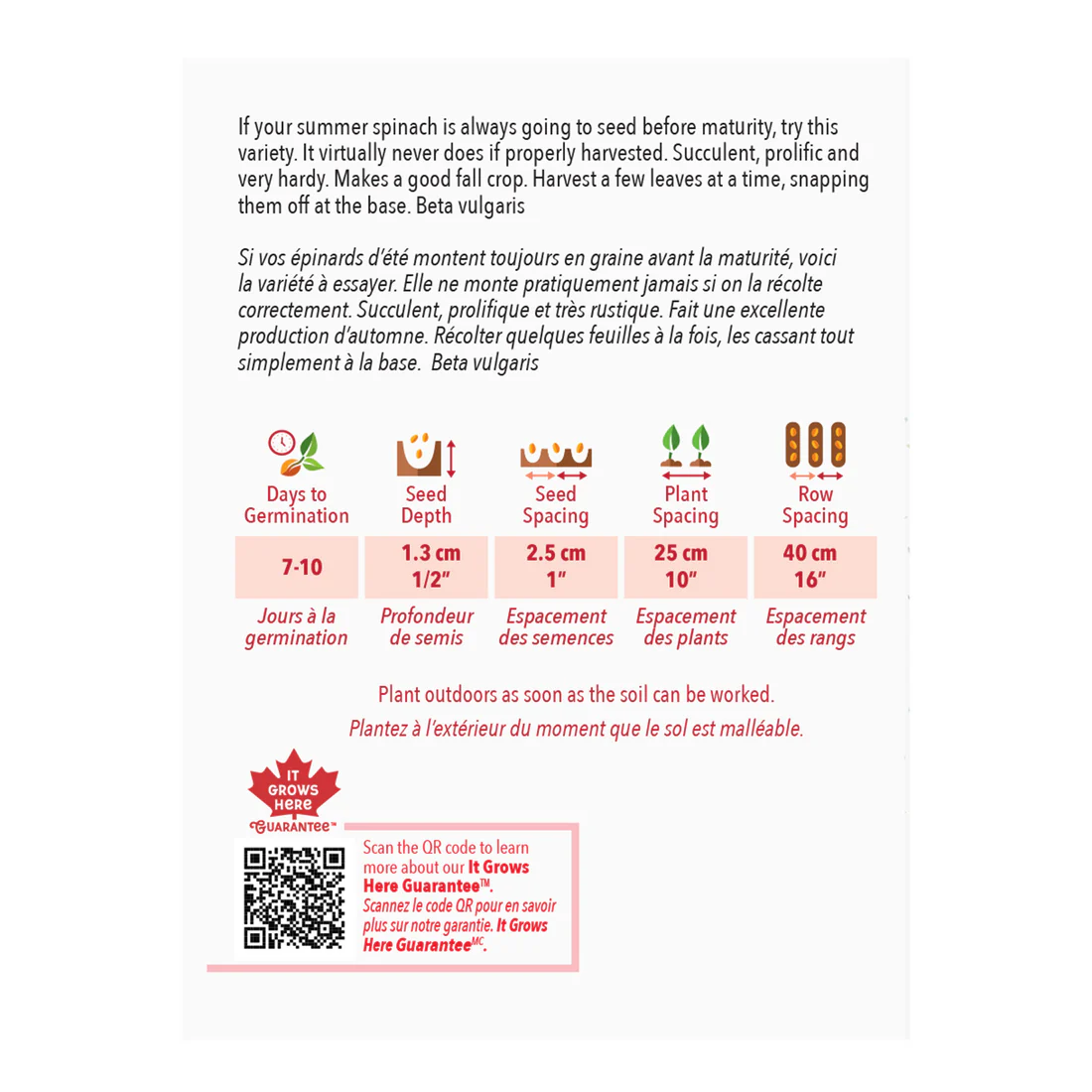 Si vos épinards d’été montent toujours en graine avant la maturité, voici la variété à essayer. Elle ne monte pratiquement jamais si on la récolte correctement. Succulent, prolifique et très rustique. Fait une excellente production d’automne. Récolter quelques feuilles à la fois, les cassant tout simplement à la base. Beta Vulgaris