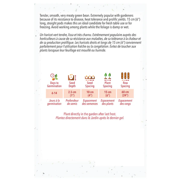 Un haricot vert tendre, lisse et très charnu. Extrêmement populaire auprès des horticulteurs à cause de sa résistance aux maladies, de sa tolérance à la chaleur et de sa production prolifique. Les haricots droits et longs de 15 cm (6″) conviennent parfaitement pour l’utilisation fraîche ou la congélation. Évitez de toucher aux plants lorsque leur feuillage est mouillé ou humide.