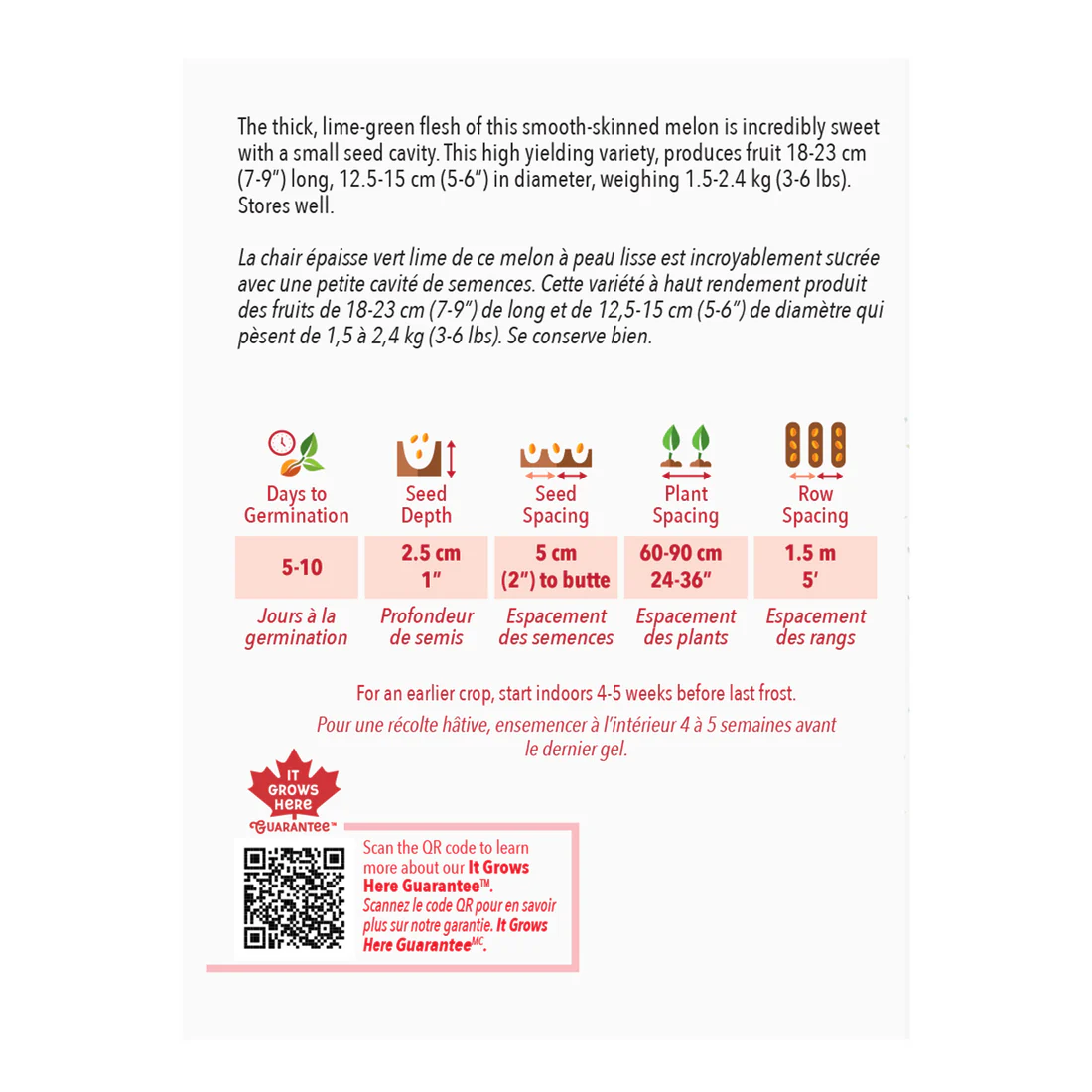 La chair épaisse vert lime de ce melon à peau lisse est incroyablement sucrée avec une petite cavité de semences. Cette variété à haut rendement produit des fruits de 18-23 cm (7-9″) de long et de 12,5-15 cm (5-6″) de diamètre qui pèsent de 1,5 à 2,4 kg (3-6 lbs). Se conserve bien