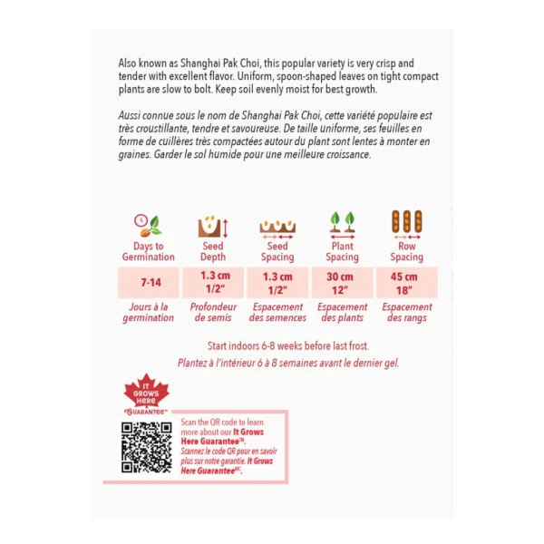 Aussi connue sous le nom de Shanghai Pak Choi, cette variété populaire est très croustillante, tendre et savoureuse. De taille uniforme, ses feuilles en forme de cuillères très compactées autour du plant sont lentes à monter en graines. Garder le sol humide pour une meilleure croissance.