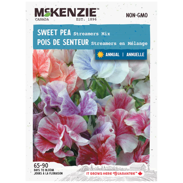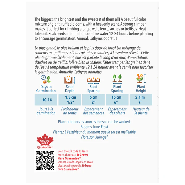 Le plus grand, le plus brillant et le plus doux de tous! Un mélange de couleurs magnifiques à fleurs géantes volantées, à la senteur céleste. Cette plante grimpe facilement, elle est parfaite le long d’un mur, d’une clôture, d’arches ou de treillis. Tolère bien la chaleur. Faites tremper les graines dans de l’eau à température ambiante 12 à 24 heures avant le semis pour favoriser la germination. Annuelle. Lathyrus Odoratus.