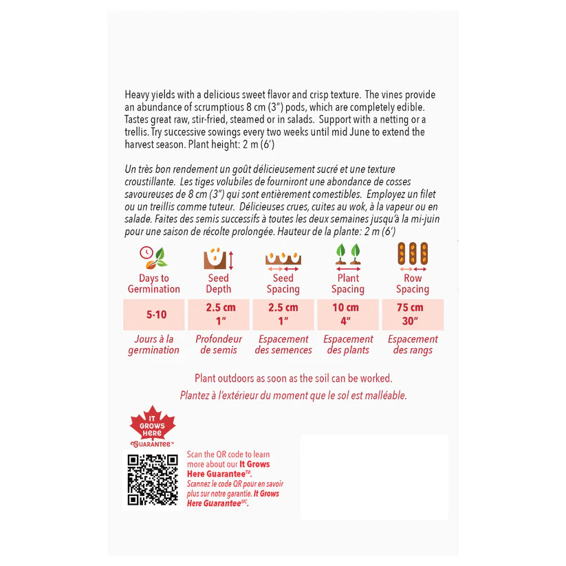 Un très bon rendement un goût délicieusement sucré et une texture croustillante. Les tiges volubiles fourniront une abondance de cosses savoureuses de 8 cm (3″) qui sont entièrement comestibles. Employez un filet ou un treillis comme tuteur. Délicieuses crues, cuites au wok, à la vapeur ou en salade. Faites des semis successifs à toutes les deux semaines jusqu’à la mi-juin pour une saison de récolte prolongée. Hauteur de la plante: 2 m (6″)