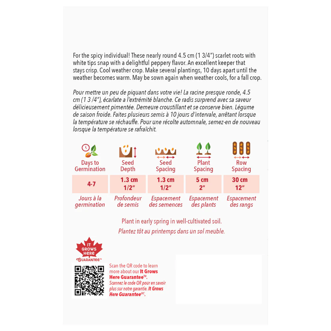 Pour mettre un peu de piquant dans votre vie! La racine presque ronde, 4,5 cm (1 3/4″), écarlate à l’extrémité blanche. Ce radis surprend avec sa saveur délicieusement pimentée. Demeure croustillant et se conserve bien. Légume de saison froide. Faites plusieurs semis à 10 jours d’intervalle, arrêtant lorsque la température se réchauffe. Pour une récolte automnale, semez-en de nouveau lorsque la température se rafraîchit.