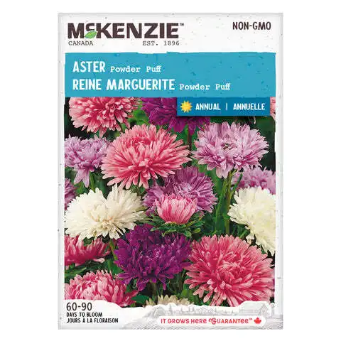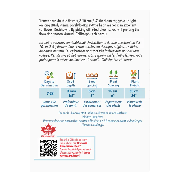 Les fleurs énormes semblables au chrysanthème double mesurent de 8 à 10 cm (3-4″) de diamètre et sont portées sur des tiges érigées et solide de bonne hauteur. Leur forme et port sont très intéressants pour la fleur coupée. Résistantes au flétrissement. En supprimant les fleurs fanées, vous prolongerez la saison de floraison. Annuelle. Callistephus Chinensis.