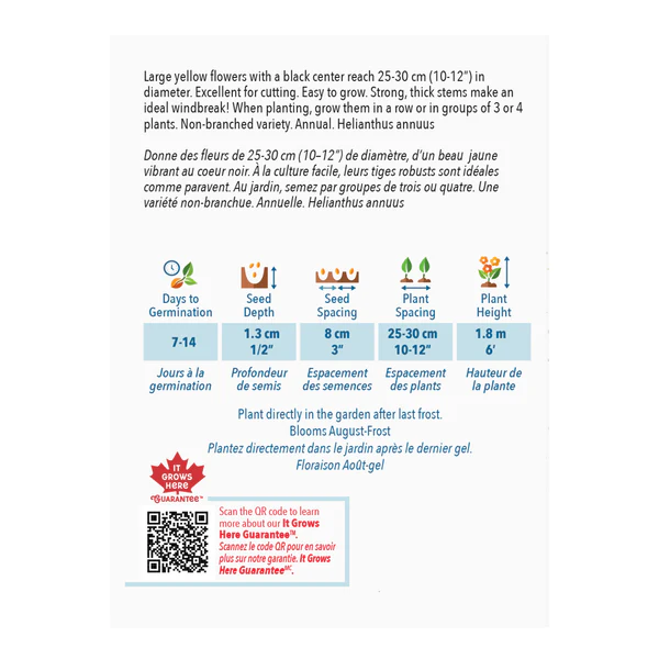 Donne des fleurs de 25-30 cm (10-12″) de diamètre, d’un beau jaune vibrant au cœur noir. À la culture facile, leurs tiges robustes sont idéales comme paravent. Au jardin, semez par groupe de trois ou quatre. Une variété non-branchue. Annuelle. Helianthus Annuus
